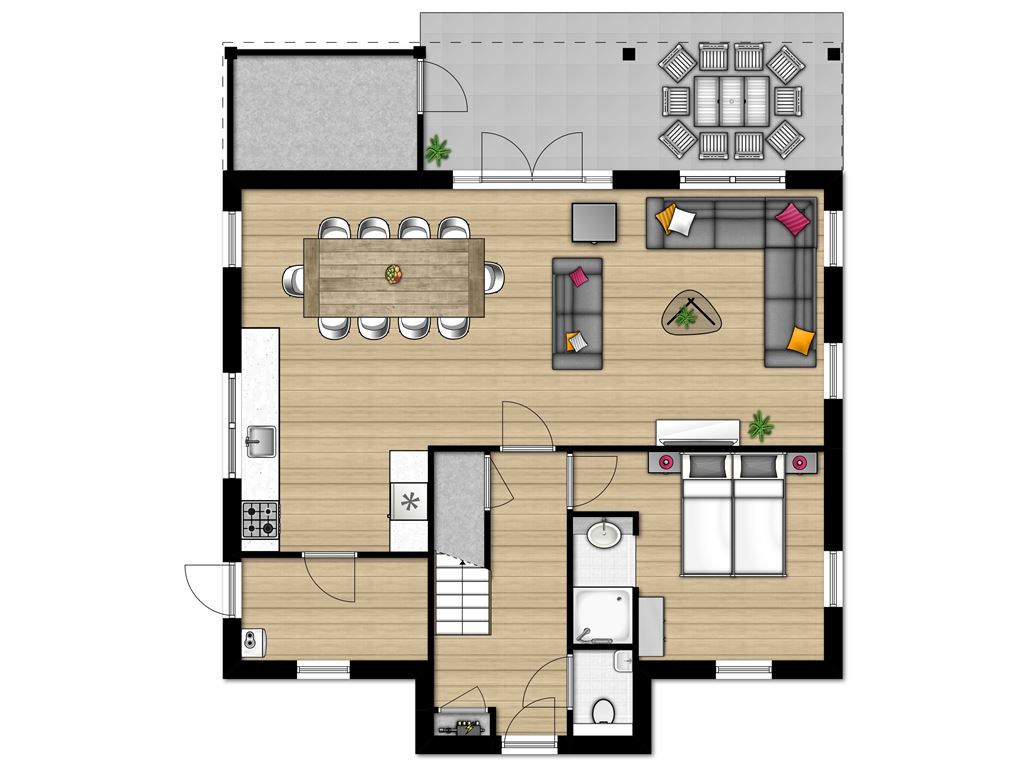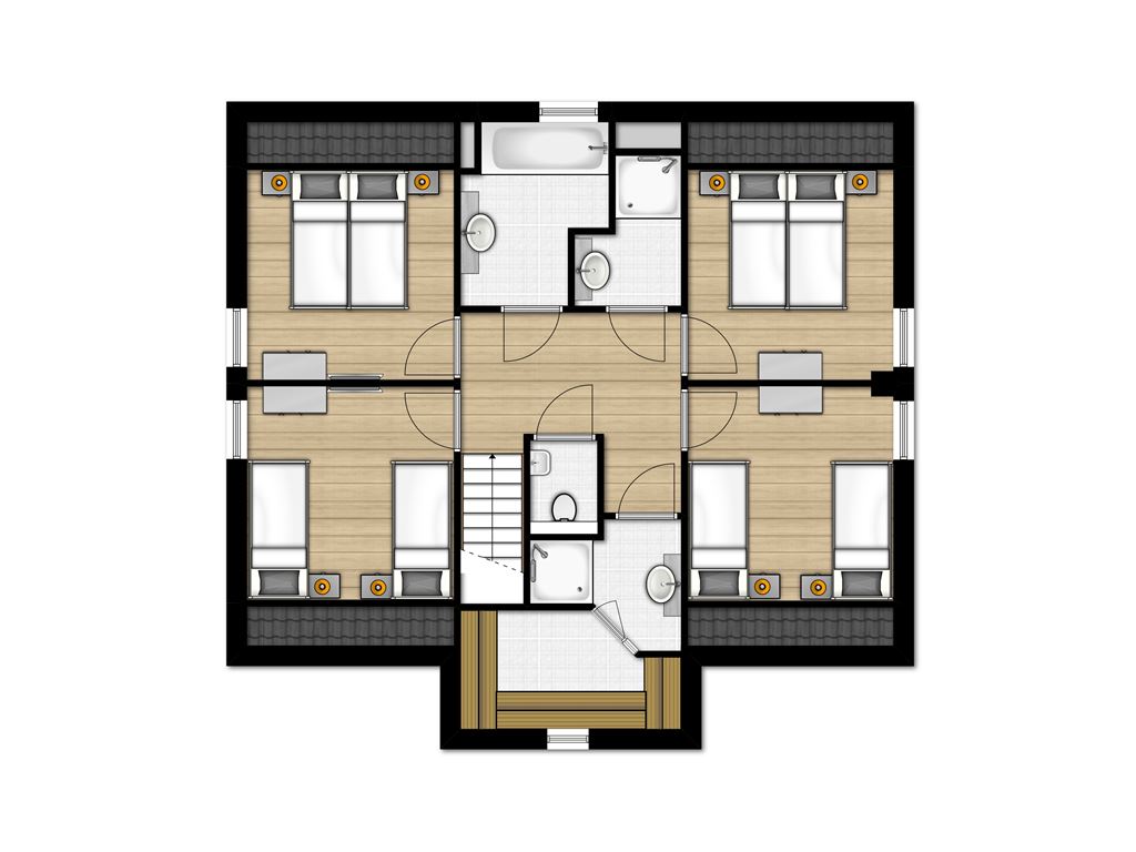 - Two bathrooms with shower cubicle and washbasin on the first floor