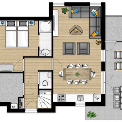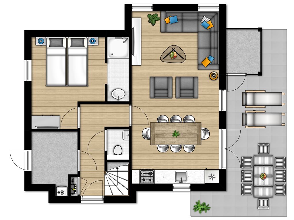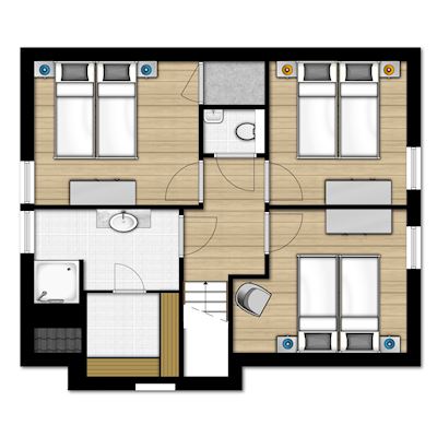 - Bedroom with two single box spring beds and flatscreen-TV on the ground floor