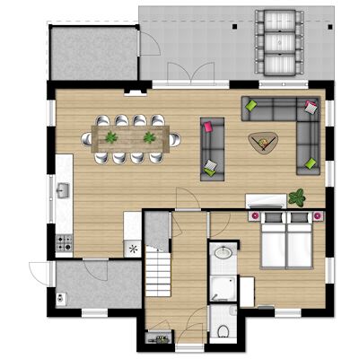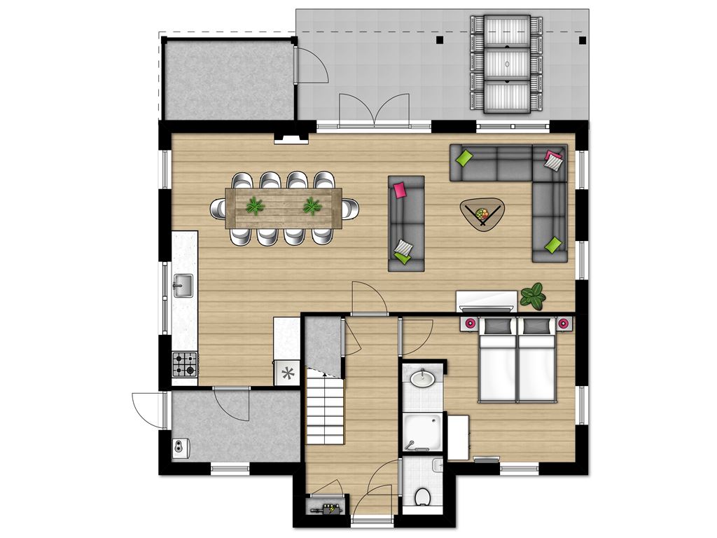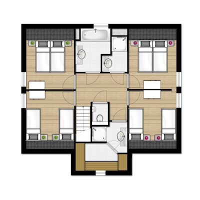 - Two bathrooms with shower cubicle and washbasin on the first floor