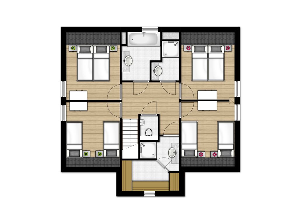 - Bedroom with two single box spring beds and flatscreen-TV on the ground floor