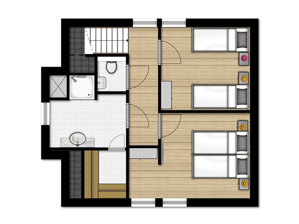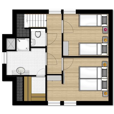 - Bedroom with two single box spring beds and flatscreen-TV on the first floor