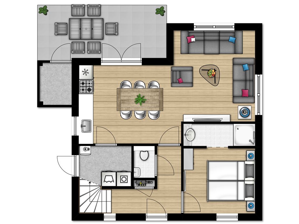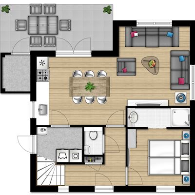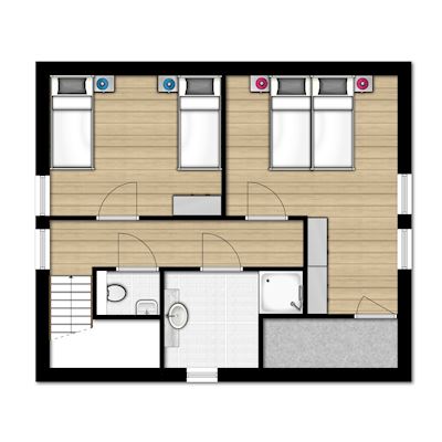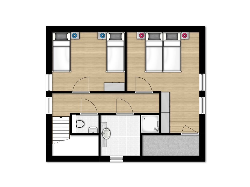 - Bedroom with two single box spring beds and flatscreen-TV on the ground floor