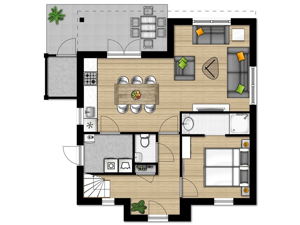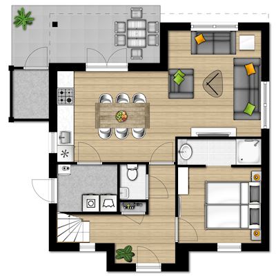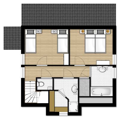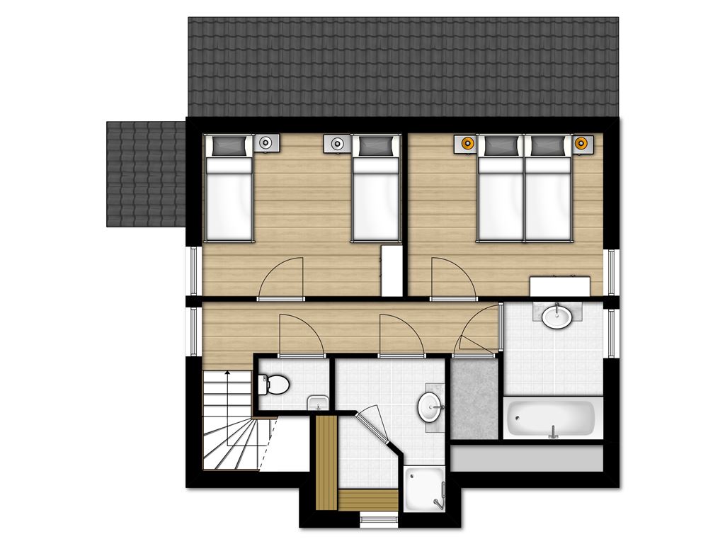 - Bedroom with two single box spring beds and flatscreen-TV on the ground floor