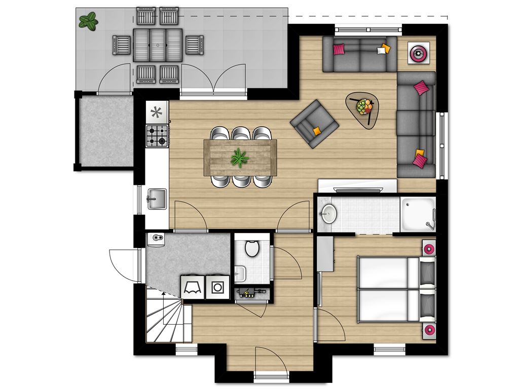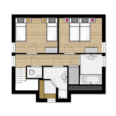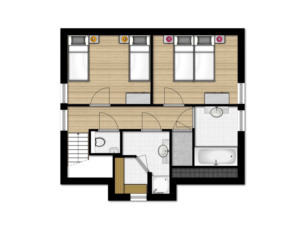- Bedroom with two single box spring beds and flatscreen-TV on the ground floor