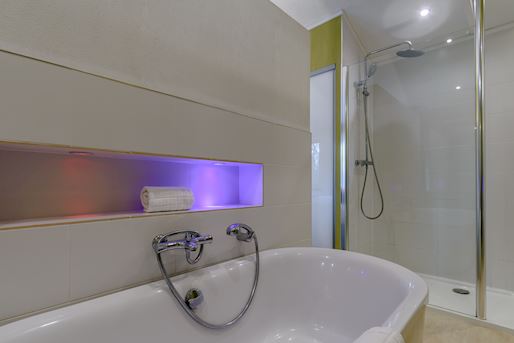- En-suite bathroom with shower cubicle, double shower head, wash basin and toilet