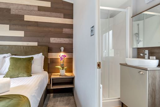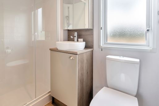 - En-suite bathroom with shower cubicle, wash basin and toilet