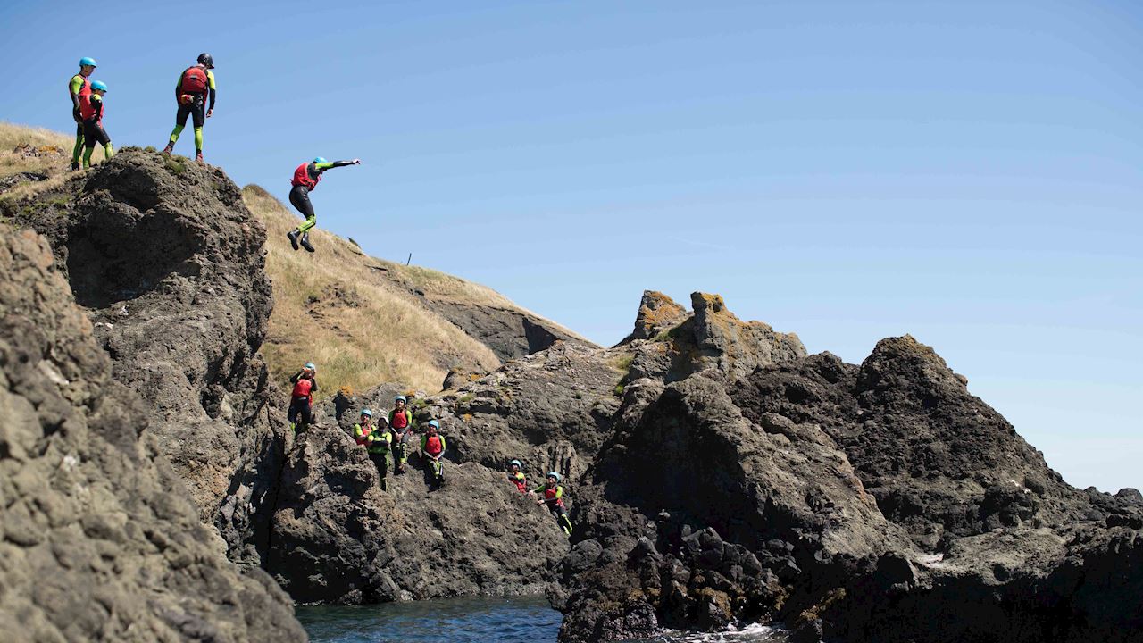 Perfect for mixed-ability or larger groups, coasteering puts a big tick in the adventure box without being too intimidating. You’ll essentially be navigating the rocky coastline and caves through walking, jumping, clambering and sea swimming, but most instructors will be able to tailor your experience to your group members’ ages, abilities and appetite for risk. For those who are a little more cautious there’s usually an alternative route around obstacles, and buoyancy aids are a standard part of the kit. Meanwhile, adrenalin junkies can opt for the biggest jumps possible!